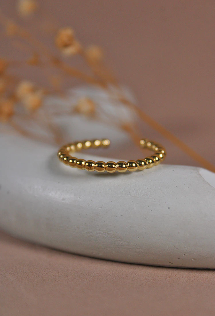 Anillo formado por pequeñas bolitas unidas que crean un diseño delicado y lleno de detalle. Constelación simboliza la conexión entre puntos que, juntos, brillan con fuerza. Perfecto para usar solo o combinar con otros anillos y crear tu propio estilo. ✨